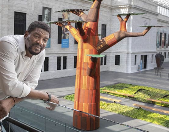 A sculptural rendering of a tree anchors the work at the east end of the atrium and evokes the iroko tree found in the Igbo ámà.