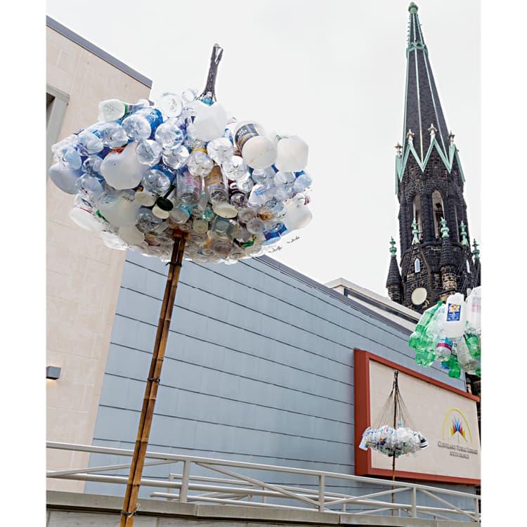 A 3D sculptural diorama of Cleveland’s cityscape as imagined in the future uses sustainable and repurposed materials. After the installation, the work will be reused in the upcoming Pride parade.
