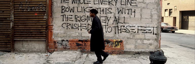 Jean-Michel Basquiat on the set of Downtown 81, 1980–81. Edo Bertoglio (Swiss, born 1951). 35 mm slide. © New York Beat Films, LLC. Courtesy Maripol. By permission of the Estate of Jean-Michel Basquiat, all rights reserved