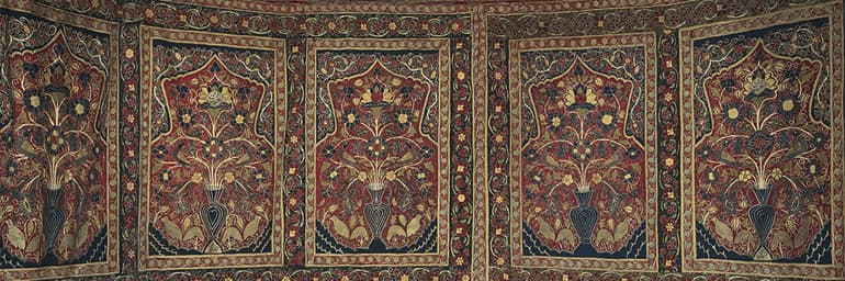 This royal tent retains its complete ceiling, with each roof panel displaying birds flanking the base of blossoming branches. Seven of the original fourteen wall panels form a semicircle, which allows visitors to see and enter the ornate interior. Featuring inlaid, brilliantly colored woolen cloth embellished with silk-thread embroidery, each interior wall panel is decorated with a single large vase of exuberant blossoms set between robust birds on a rocky mound under a niche with blossoming vines. The exterior, in contrast, is covered with a plain red cotton cloth.