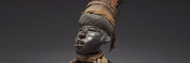Male Figure (detail), late 1800s–early 1900s. Democratic Republic of the Congo, Cabinda, or Republic of the Congo, probably Vili people. Wood, fabric, shells, beads, feathers, resin, glass, twine or cord; h. 42 cm. René and Odette Delenne Collection, Leonard C. Hanna Jr. Fund 2010.433.