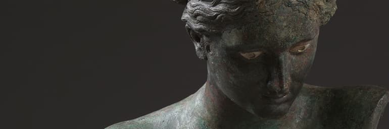 Apollo the Python-Slayer (detail), formerly Apollo Sauroktonos (Lizard-Slayer), c. 350 BC. Attributed to Praxiteles (Greek, c. 400 BC–330 BC). Bronze, copper, and stone inlay; 150 x 50.3 x 66.8 cm. The Cleveland Museum of Art, Severance and Greta Millikin Purchase Fund 2004.30.a