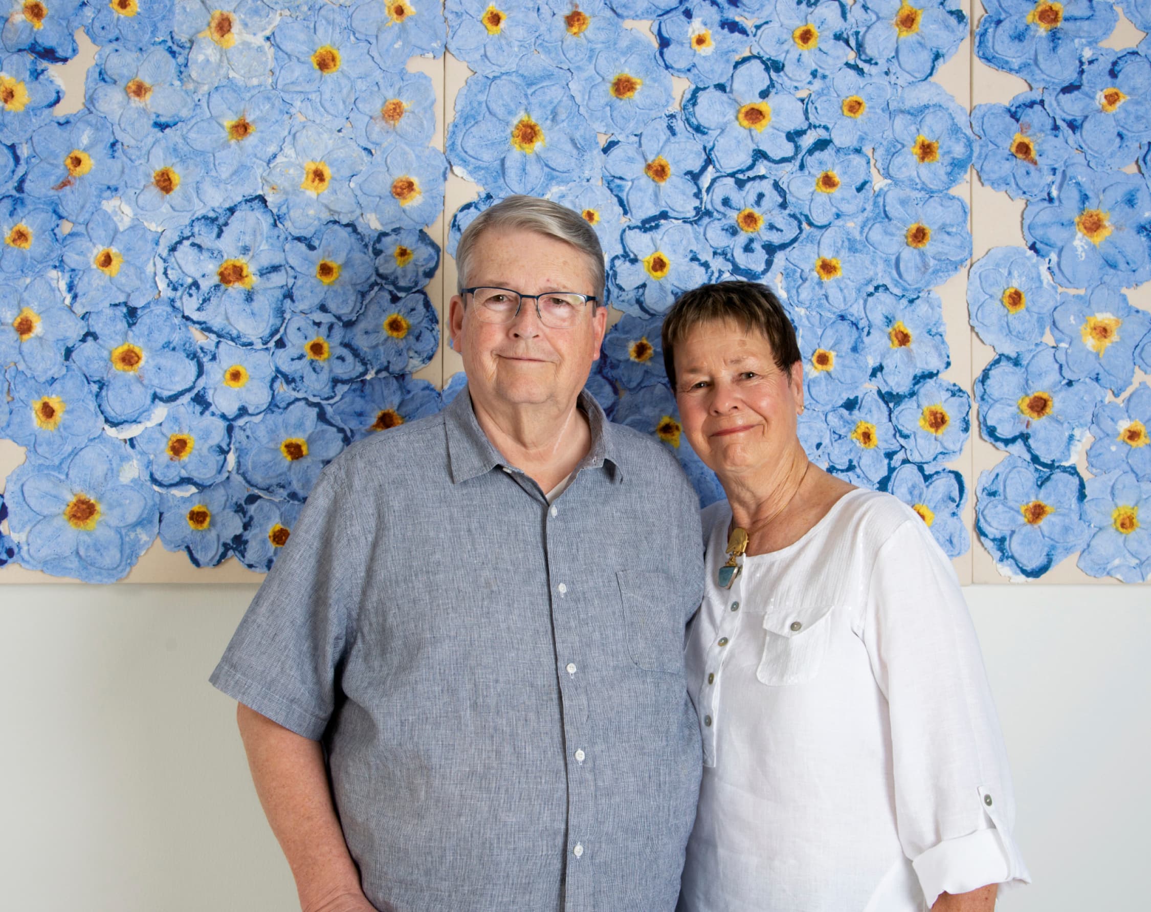 The Heusingers in front of Season of hope and courage; Myosotis sylvatica (woodland perennial); common name, forget-me-not by Maggie Denk-Leigh, associate professor and printmaking department chair at the Cleveland Institute of Art