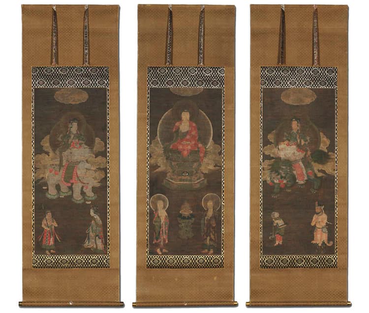 Shakyamuni Triad: Buddha Attended by Manjushri and Samantabhadra late 13th–early 14th century. China, Yuan dynasty (1279–1368). Triptych of three hanging scrolls: ink and color on silk; each 106.9 x 46.4 cm. Purchase from the J. H. Wade Fund 2009.342.1–3