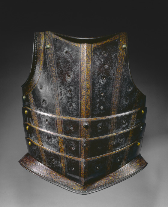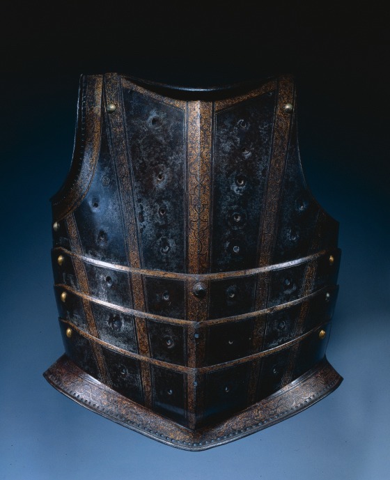 This style of breastplate, with its numerous articulating lames, was probably used by a Hungarian hussar, a type of light cavalryman. The steel plates were originally blued-now turned russet-and etched and gilded with strapwork bands. The rows of vertical holes once provided gilt-brass settings for stones or glasspaste jewels. The effect would have suggested the semi-oriental costume and armor of the Near East favored by Polish and Hungarian armies of the late Renaissance.