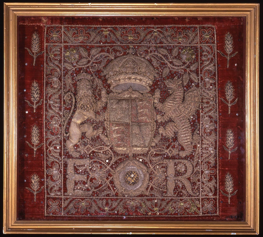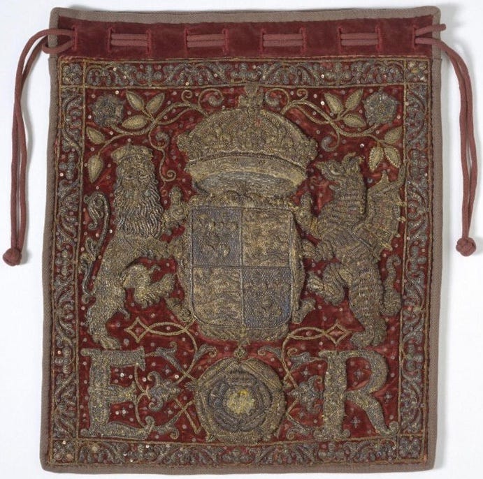 Figure 3. Burse for the Great Seal of Elizabeth I, c. 1596–c. 1603. Velvet embroidered with gold and silver metal thread; 52 x 47 cm. The British Museum, London, 1997,0301.1. © The Trustees of the British Museum