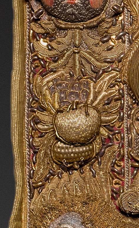 Join us next month as we delve deeper into where the CMA’s burse sits in the history of burses, the precious materials from which the CMA’s burse is made, and the Worshipful Company of Gold & Silver Wyre Drawers. Founded in 1623 to protect the trade interests of those who produced gold and silver wire for use in lavish embroidery such as seen in Cleveland’s burse, the Gold & Silver Wyre Drawers remains one of a number of trade groups referred to as The City of London Livery companies, with a history stretching back over 700 years. Today the combined groups are one of the most powerful philanthropic movements in the world, with 35,000 liverymen. Each year the Gold & Silver Wyre Drawers funds an apprenticeship at the Royal School of Needlework based at Hampton Court Palace, and annually they also sponsor an award for designers of jewelry made from precious and semiprecious wire through the Goldsmith’s Craft and Design Council.