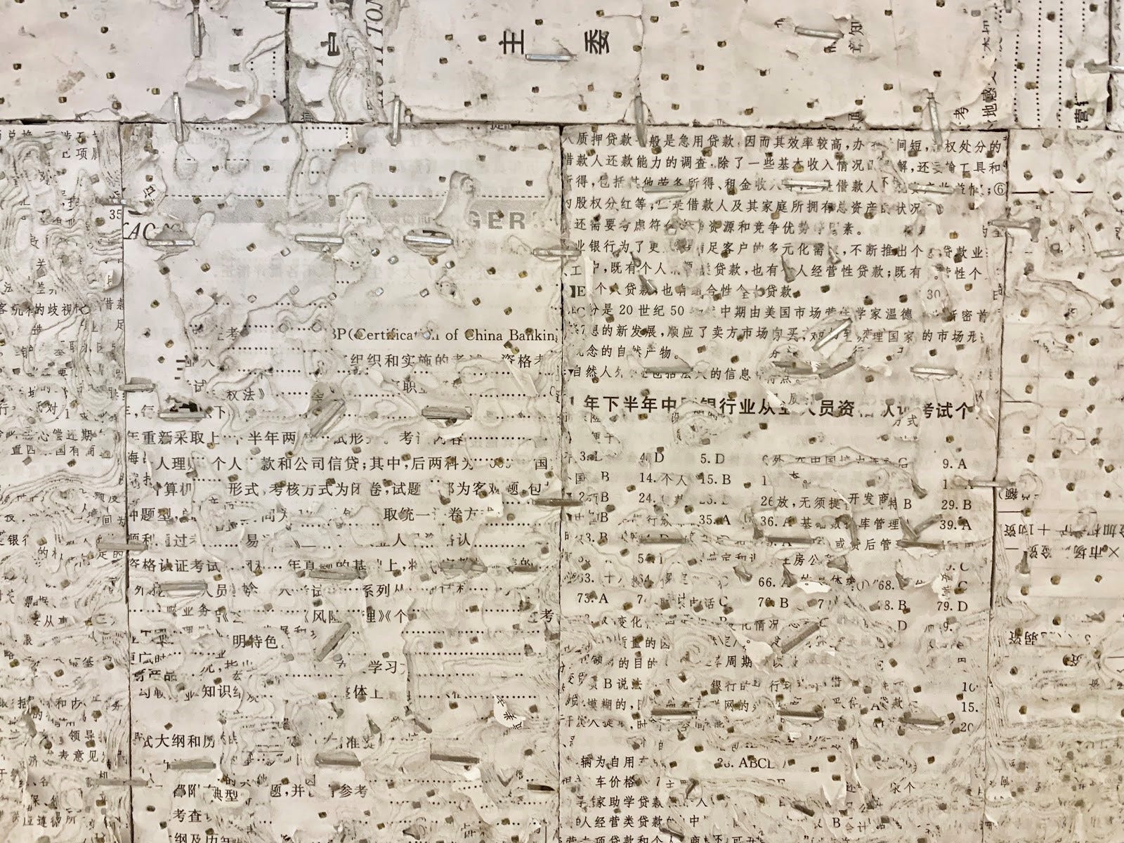 “Cutting,” a signature practice for the artist since 1998, is also employed in the installation works Look! Books (2014) and Library V–III (2014), in which the artist experiments with the use of compressed print materials and books as a medium for sculpture. Majestically standing in front of viewers, the meticulously carved sculptures, made up of a variety of geometric forms, present a forbidding, challenging landscape of monoliths that rise from the ground like an impassable mountain range or a complex acropolis. As Liu explains, “Books are the carriers of knowledge, but also a reliable source for people to collectively make sense of the past, present, and future realities of a city. Using ‘cut’ to destroy books is a symbolic way to interrupt knowledge systems.”