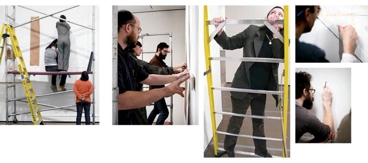 Cleveland Heights native Megan Dyer and her husband, Tomas Ramberg, installed the museum’s drawing with the help of Michael Marks and Arthur Beukemann from the museum’s installation crew. Dyer describes the process: “With a work that’s been done before, the main object is to recreate the first version as precisely as we can. This work is part of a theme Sol LeWitt came back to over and over, called Lines in Four Directions. I’ve done this one, I suppose, about 15 times—sometimes in fine pencil, like this, other times in big thick lines of acrylic or wax, depending on the scale.