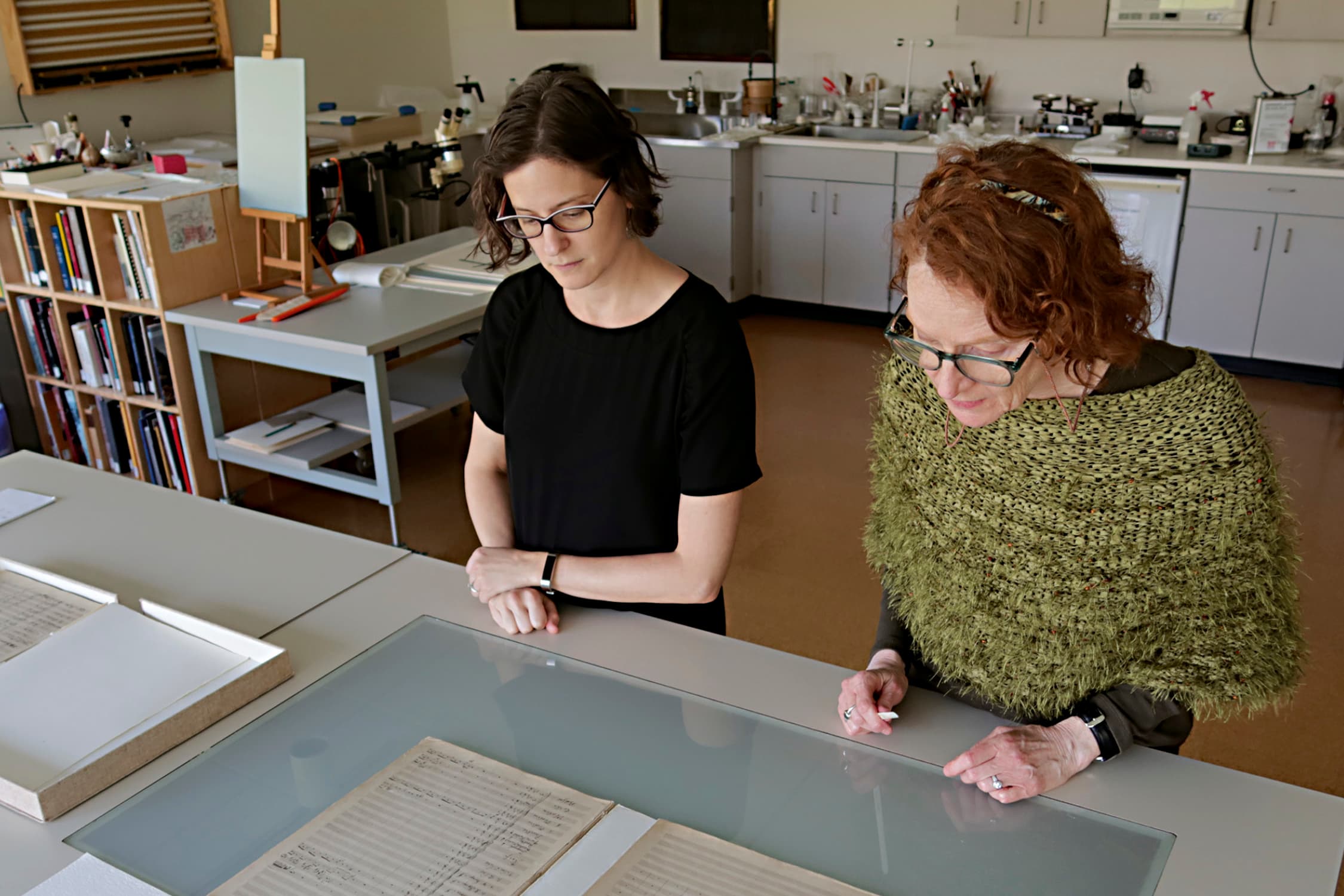 Andria Hoy, archivist for the Cleveland Orchestra, and Moyna Stanton, CMA paper conservator, discuss Mahler’s elegant handwriting in pen and ink on the manuscript’s professional staff paper.