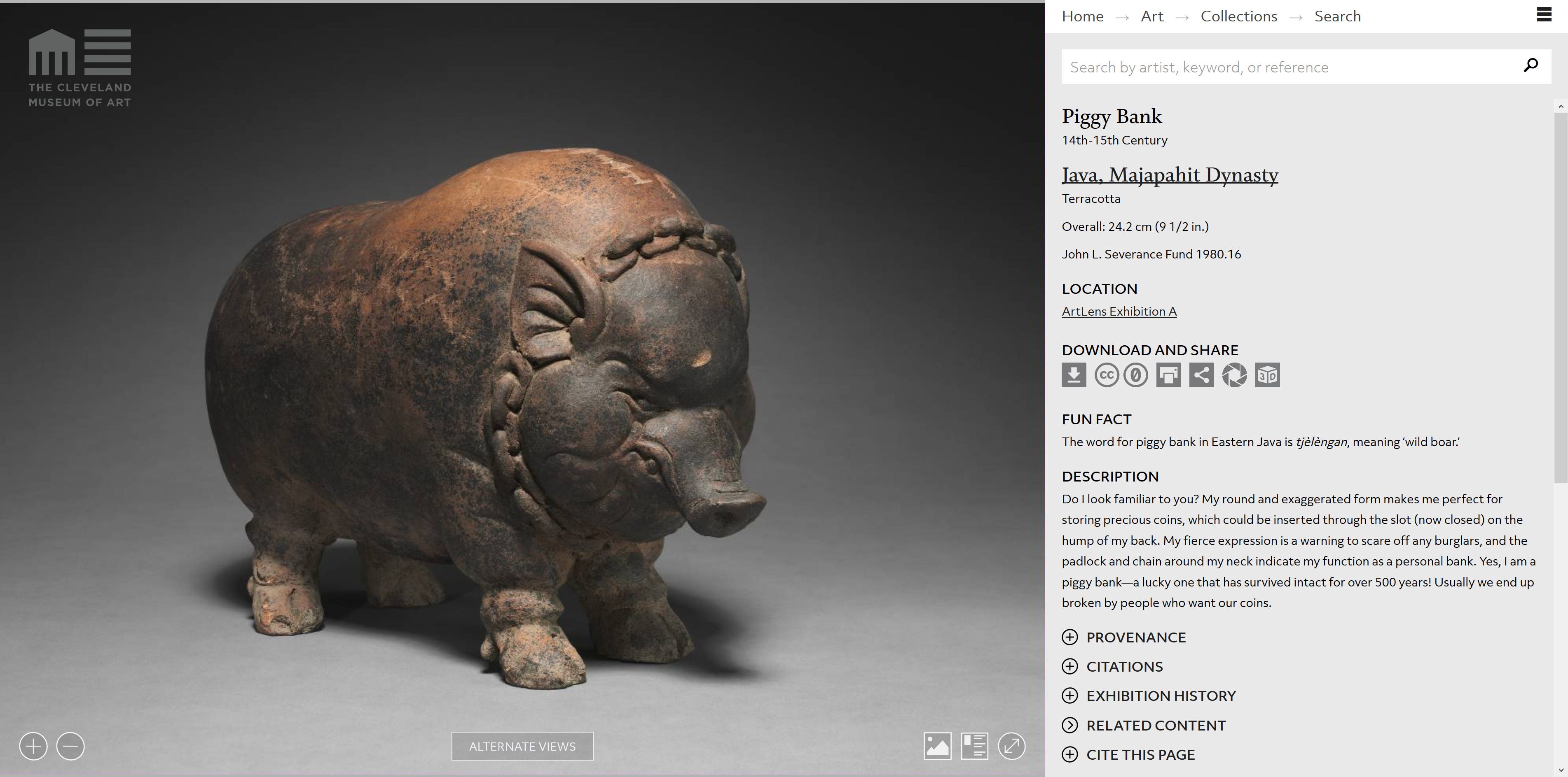 Earlier this year, director William Griswold introduced the CMA’s Open Access initiative as a logical and exciting outgrowth of the CMA’s mission to create transformative experiences through art, for the benefit of all the people forever. In addition to around 30,000 images of public-domain artworks, metadata relevant to more than 61,000 records is available without restriction, whether the works are in the public domain or under copyright. Objects are now linked to brand-new content, from videos to 3-D models, all within a sleek modern framework.