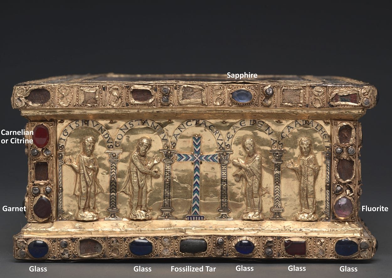 The Portable Altar of Countess Gertrude, made of gold and sumptuously decorated with precious and semiprecious materials, is a masterpiece of early medieval craftsmanship. Although a great deal of the decoration is lost (only 46 of the original 92 large stones survive), the original wealth of the altar can be imagined by what remains. The mineralogy department at the Cleveland Museum of Natural History helped identify the stones as sapphire, garnet, fluorite, amethyst, emerald, and carnelian; also present are red, green, and blue glass, along with a piece of fossilized tar.