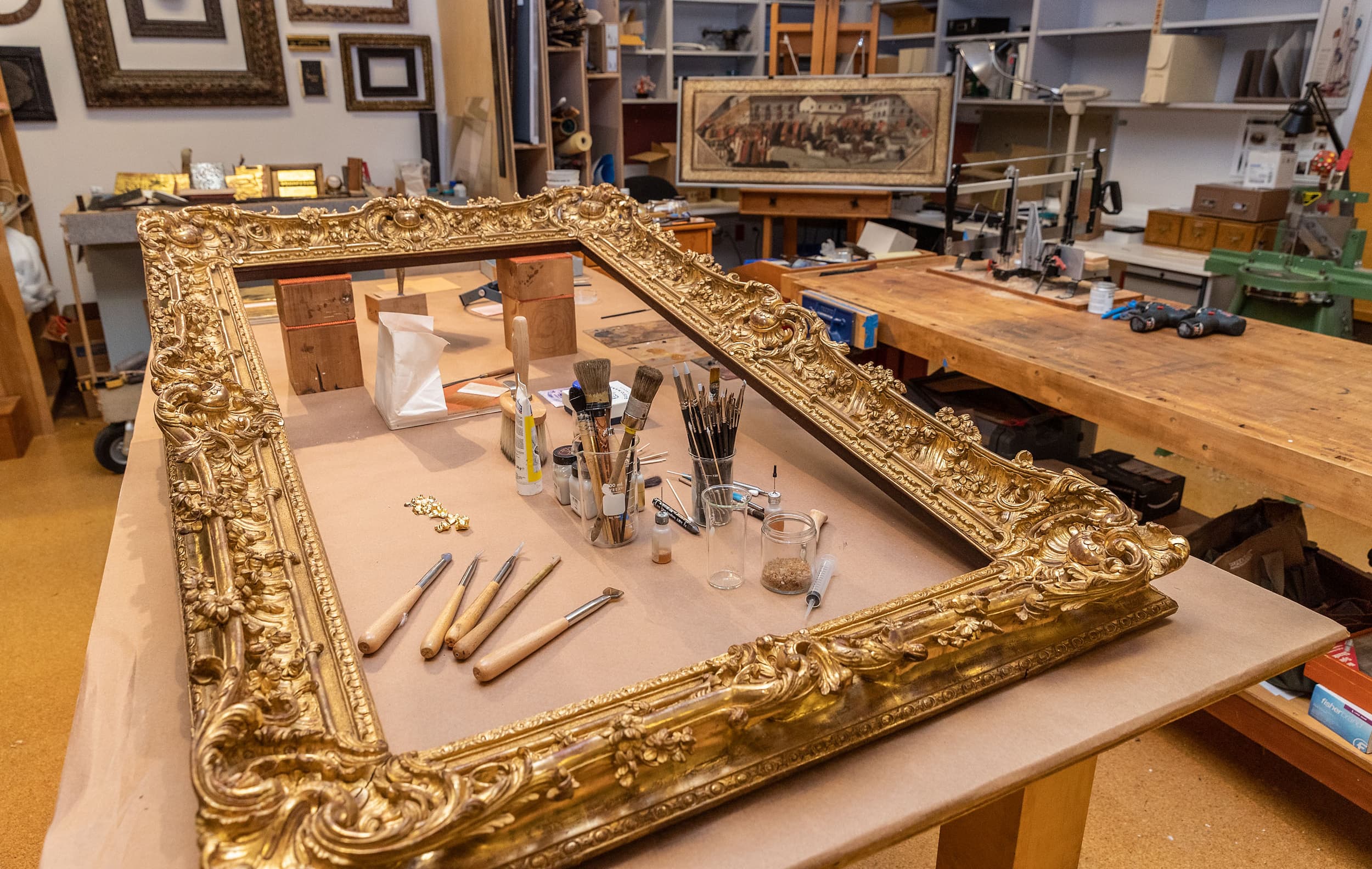 The frames lab is responsible for glazing paintings and creating microclimate vitrines for paintings that are more sensitive to environmental fluctuations. Work is often underway to stabilize and repair frames in the collection. This includes consolidation of loose and unstable ornamentation, cleaning grime and older nonoriginal coatings, and replicating lost ornamentation.