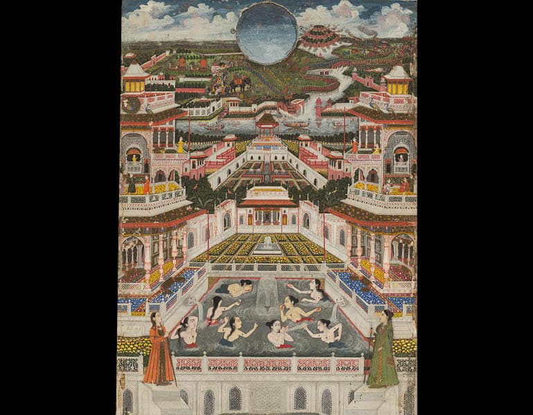 Women bathing before an architectural panorama, c. 1765. Fayzullah (Indian, active c. 1730–1765). Opaque watercolor with gold on paper; painting: 32.2 x 22.7 cm (12 11/16 x 8 15/16 inches). Gift in honor of Madeline Neves Clapp; Gift of Mrs. Henry White Cannon by exchange; Bequest of Louise T. Cooper; Leonard C. Hanna Jr. Fund; From the Catherine and Ralph Benkaim Collection, 2013.344.