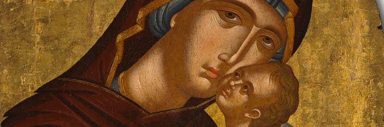 Icon of the Mother of God and Infant Christ (Virgin Eleousa) (detail), c. 1425-1450. Attributed to Angelos Akotantos (Greek). Tempera and gold on wood panel; 96 x 70 cm. Leonard C. Hanna, Jr. Fund 2010.154