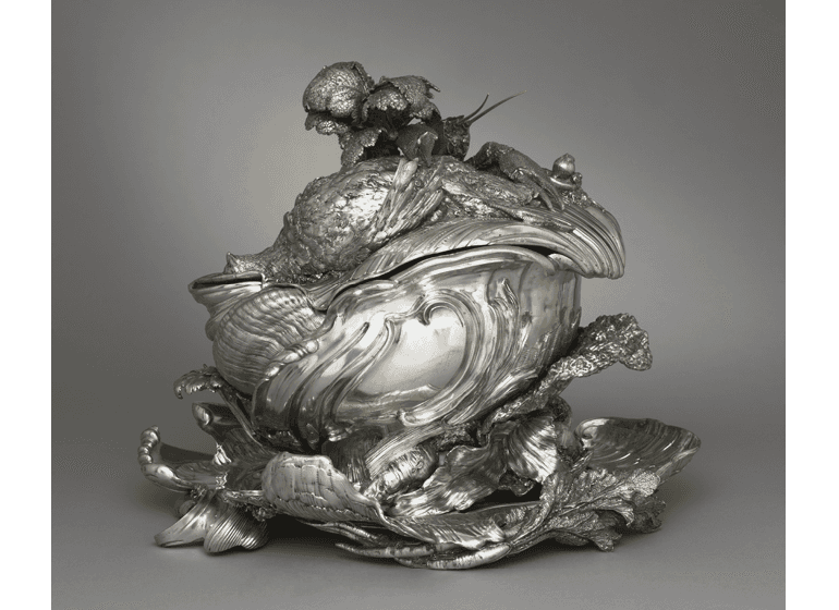 Covered Tureen on Stand (Pot-à-oille), 1735–38. Juste-Aurèle Meissonnier (French, 1695-1750), Pierre-François Bonnestrenne (French), Henry Adnet (French, 1745). Silver; overall: 36.9 x 38.4 x 31.8 cm. The Cleveland Museum of Art, Leonard C. Hanna Jr. Fund, 1977.182