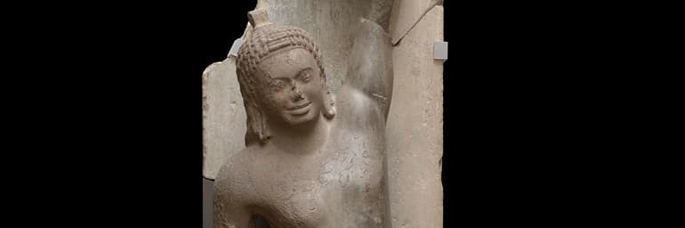 Krishna Lifting Mount Govardhan after 2020 restoration, c. 600. Southern Cambodia, Takeo Province, Phnom Da. Sandstone; 203.1x 68 x 55.5 cm. The Cleveland Museum of Art, John L. Severance Fund, 1973.106