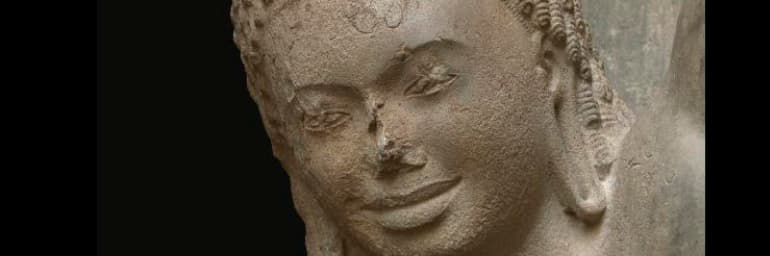 Krishna Lifting Mount Govardhan (detail), c. 600. Southern Cambodia, Takeo Province, Phnom Da. Sandstone; 203.1 x 68 x 55.5 cm. The Cleveland Museum of Art, John L. Severance Fund, 1973.106