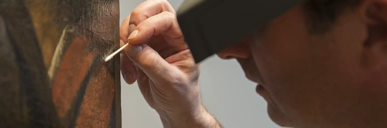 Conservator of Paintings Dean Yoder cleans The Crucifixion of Saint Andrew by Caravaggio. Photograph by Howard Agriesti