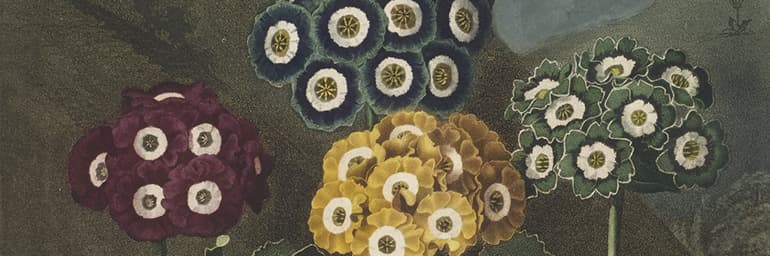 A Group of Auriculas (detail), 1803. Frederick Lewis (British, 1779–1856) and James I. Hopwood (British, c. 1752–1819), after Peter Charles Henderson (British, active 1799, died 1829). Color aquatint, stipple, and etching with watercolor added by hand. Gift of the Print Club of Cleveland 1949.415.