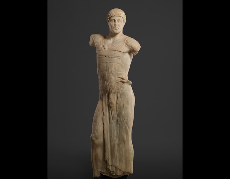 Statue of a Youth (The Mozia Charioteer) (detail), 470–460 BC. Sikeliote (Sicilian Greek). Marble; 181 x 40 cm. Courtesy of the Servizio Parco archeologico e ambientale presso le isole dello Stagnone e delle aree archeologiche di Marsala e dei Comuni limitrofi–Museo Archeologico Baglio Anselmi. By permission of the Regione Siciliana, Assessorato dei Beni Culturali e dell’Identità Siciliana. Dipartimento dei Beni Culturali e dell’Identità Siciliana. Unauthorized reproduction prohibited.