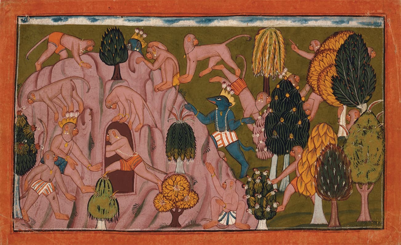 Monkeys and bears search for Sita from the “Shangri” Ramayana, c. 1700. Gum tempera and silver on paper; 21 x 33.7 cm. Los Angeles County Museum of Art, Nasli and Alice Heeramaneck Collection, Museum Associates Purchase, M.74.5.11. Digital image © 2026 Museum Associates / LACMA. Licensed by Art Resource, NY
