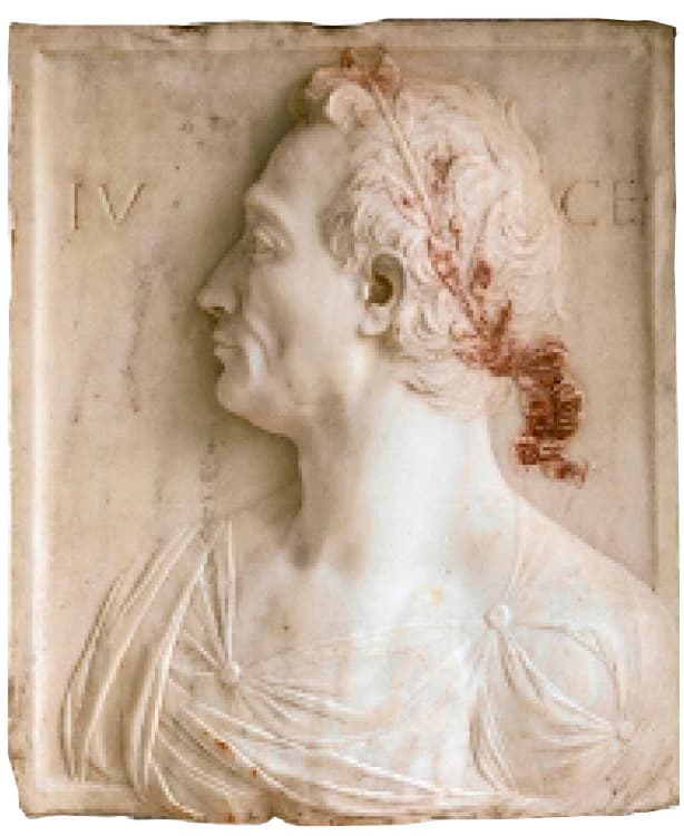 A commanding 15th-century marble relief by Mino da Fiesole depicts Julius Caesar in profile, carved with a Latin abbreviation of his name. Caesar appears w...